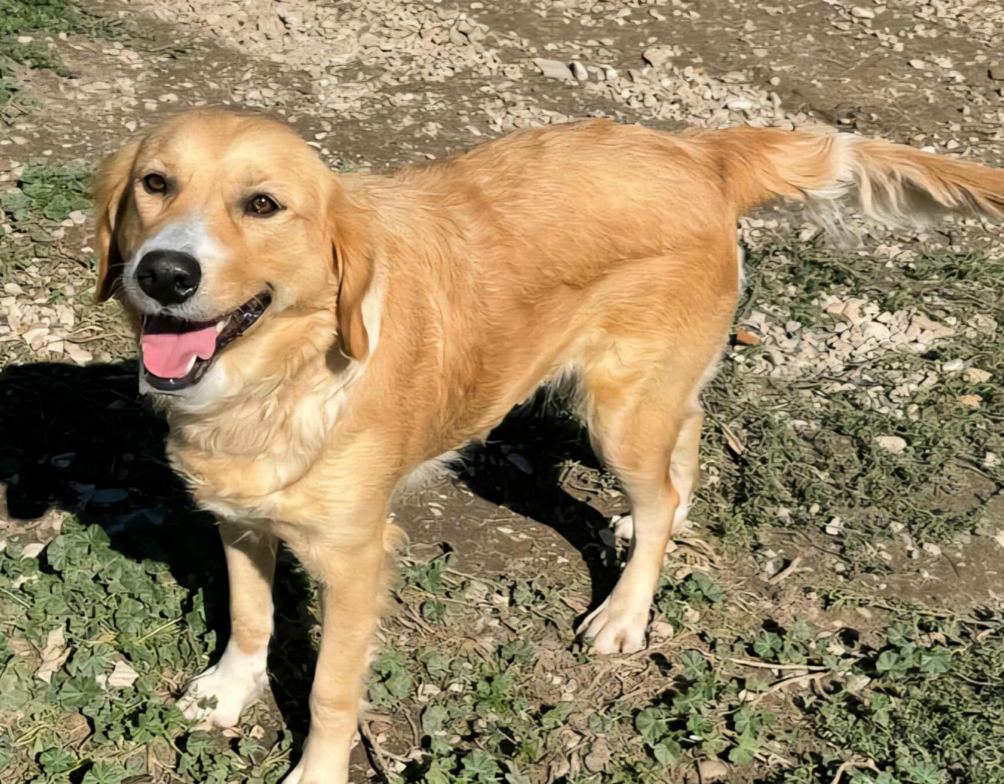 Ama uscire in passeggiata e sa andare al guinzaglio. Va d’accordo cocoi cani, maschi e femmine, e con i gatti. È una mix gGolden Retriver di 1 anno, taglia media (22 chili).