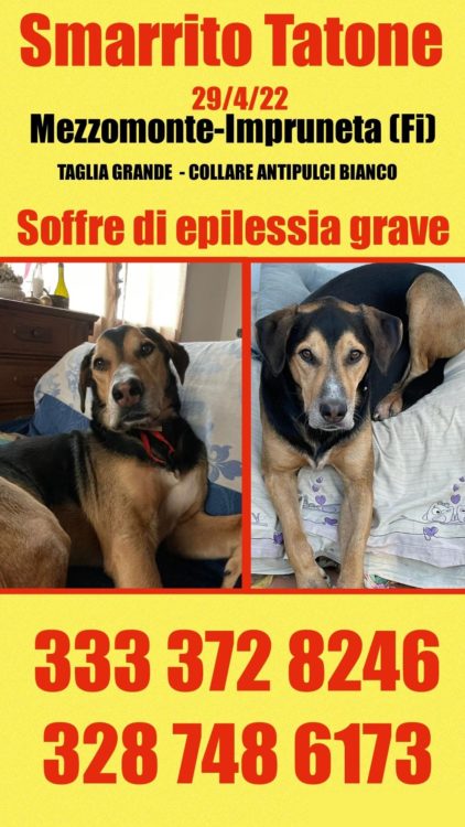 Chiediamo gentilmente di diffondere la notizia della scomparsa di Tatone, si è smarrito da Mezzomonte-Impruneta (Firenze) il 29/ aprile 2022″. A chiederci aiuto la signora Simona. Il dolce quattro zampe soffre di epilessia grave, è una taglia grande, al momento della scomparsa indossava collare antipulci bianco. Nonostante le ricerche non sono ancora riusciti a trovarlo.