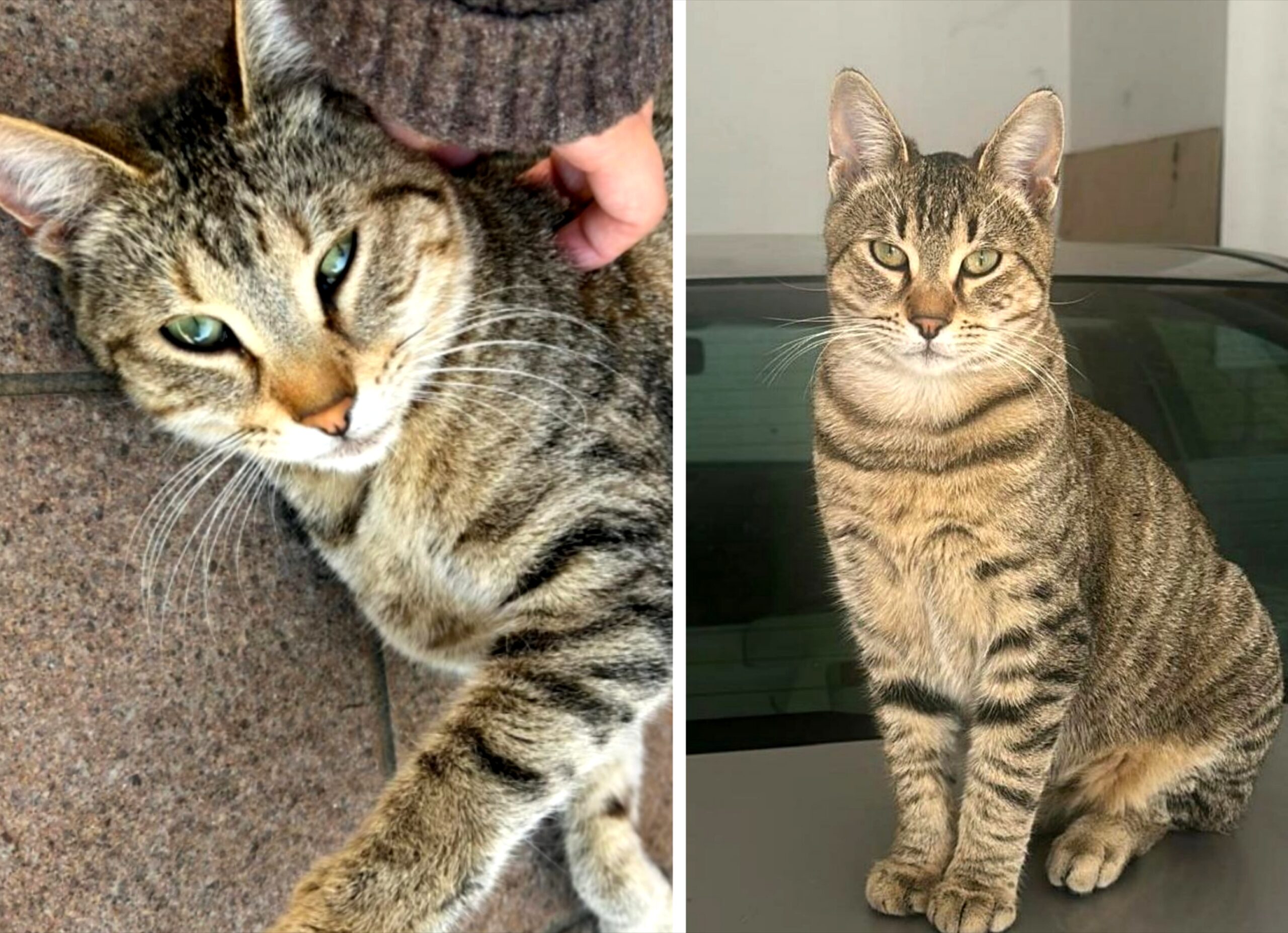 Questi due gatti tigrati in foto si sono smarriti nel quartiere Micioccoli a Rieti, tra via Ricci e via Aloisi. Tea è la femmina sdraiata, Dumbo il maschio seduto.