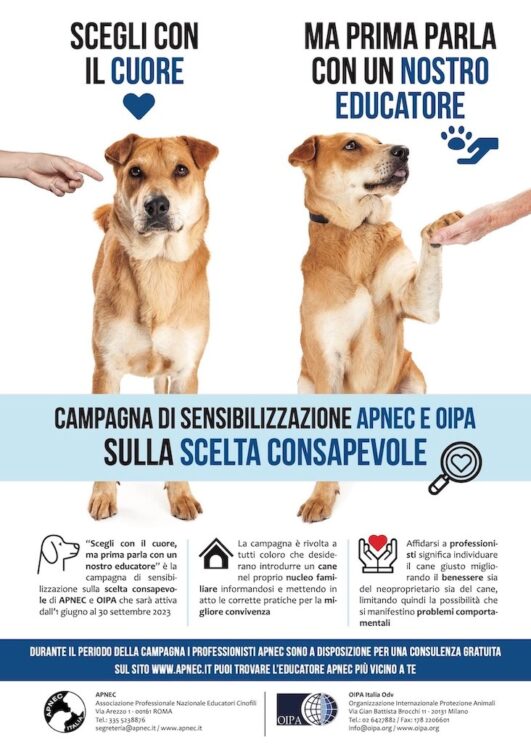 Dopo il successo dello scorso anno, torna “Scegli con il cuore ma prima parla con un nostro educatore”, la campagna di sensibilizzazione sulla “scelta consapevole” di APNEC (Associazione professionale nazionale educatori cinofili) e OIPA (Organizzazione internazionale protezione animali), che prenderà il via giovedì 1° giugno per terminare sabato 30 settembre.